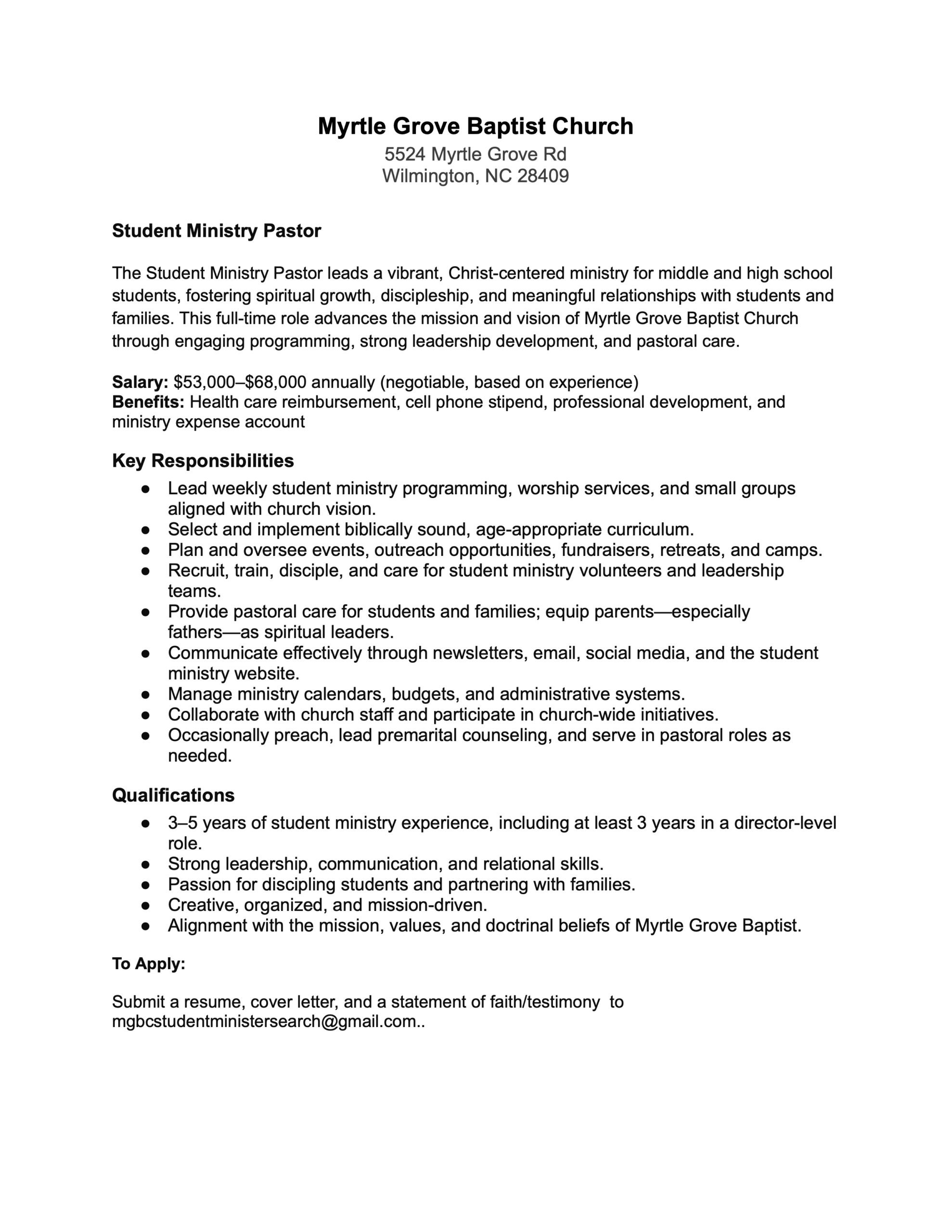 Current Opening for Student Ministry Pastor